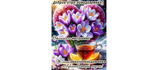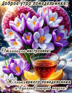 Теги:понедельник, дни недели, цветы, сердечко, красивая картинка, чай с лимоном, отличной недели, яркого понедельника, вдохновляющей недели, позитива, добра, крокусы