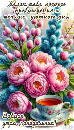 Теги:понедельник, утро, чай, цветы, пионы, верба, ель, красивая картинка, легкого пробуждения, теплого и уютного дня, дни недели