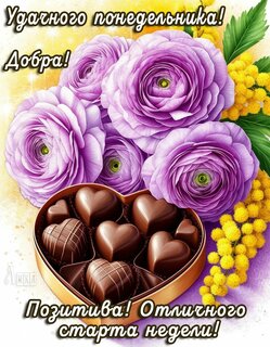 Красивая поздравительная открытка с нежными фиолетовыми цветами ранункулюса и желтой мимозой. На переднем плане — коробочка с изысканным шоколадом в форме сердечек. На картинке расположены добрые пожелания на русском языке: "Удачного понедельника! Добра! Позитива! Отличного старта недели!". Идеальное изображение для отправки друзьям и близким в мессенджерах и соцсетях для создания хорошего настроения в начале рабочей недели.