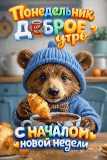 Милая и уютная открытка для поднятия настроения в начале рабочей недели. На изображении очаровательный медвежонок в синей вязаной шапке и бабочке, который держит круассан и наслаждается чашкой горячего шоколада. Яркая надпись на русском языке: «Понедельник — доброе утро! С началом новой недели». Идеально подходит для отправки друзьям, близким и коллегам в мессенджерах или социальных сетях, чтобы пожелать отличного начала недели и зарядить позитивом.