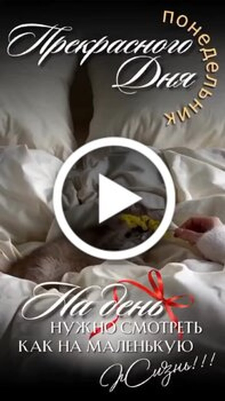 В этом видео вы увидите невероятно милый и трогательный момент с маленьким котенком. Крошечный пушистый котенок лежит на белоснежной постели и с любопытством изучает желтые цветы, которые ему подносит рука человека. Видео наполнено атмосферой нежности, уюта и тепла. Текст на экране желает прекрасного понедельника и напоминает о том, что на жизнь нужно смотреть с такой же чистотой и нежностью, как на этого малыша. Идеальный ролик для поднятия настроения и вдохновения в начале рабочей недели.