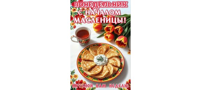 Открытка "ПОНЕДЕЛЬНИК. С НАЧАЛОМ МАСЛЕНИЦЫ! ВКУСНОЙ ВАМ НЕДЕЛИ!"