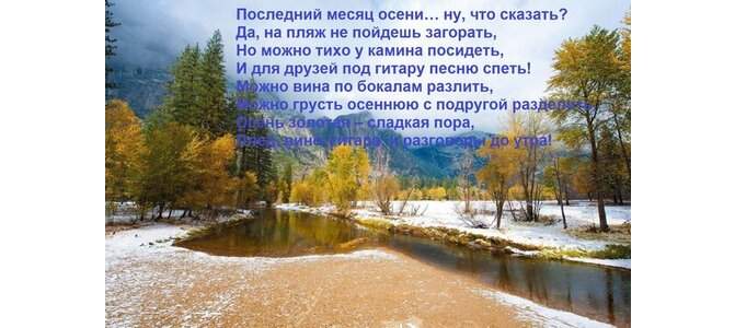 Теги:последний месяц осени ну, что сказать да, на пляж не пойдешь загорать, но можно тихо у камина посидеть, и для друзей под гитару песню спеть можно вина по бокалам разлить, можно грусть осеннюю с подругой разделить, осень золотая сладкая пора, плед, вино, гитара, и разговоры до утра