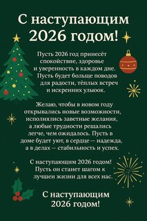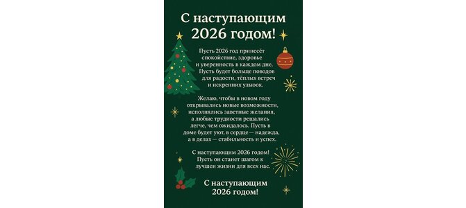 Открытка-поздравление с 2026 годом. С наступающим 2026 годом! Пусть 2026 год принесёт спокойствие, здоровье и уверенность в каждом дне. Пусть будет больше поводов для радости, тёплых встреч и искренних улыоок. Желаю, чтобы в новом rogy открывались новые возможности, исполнялись заветные желания, а любые трудности рещались легче, чем ожидалось. Пусть в доме будет уют, в сердце — надежда, а в делах стабильность и успех. С наступающим 2026 годом! Пусть он станет шагом к лучшеи жизни для всех нас. С наступающим 2026 годом!