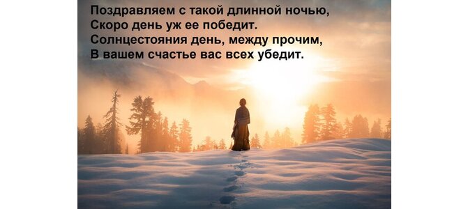 Поздравляем с такой длинной ночью, скоро день уж ее победит. Солнцестояния день, между прочим, в вашем счастье вас всех убедит.