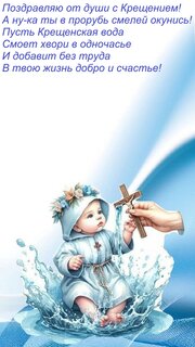 Теги:поздравляю от души с крещением а ну-ка ты в прорубь смелей окунись пусть крещенская вода смоет хвори в одночасье и добавит без труда в твою жизнь добро и счастье