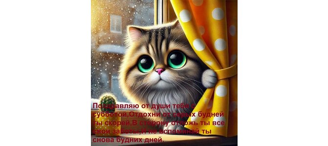 Теги:поздравляю от души тебя с субботой, отдохни от серых будней ты скорей, в сторону отложь ты все свои заботы, и не вспоминай ты снова будних дней