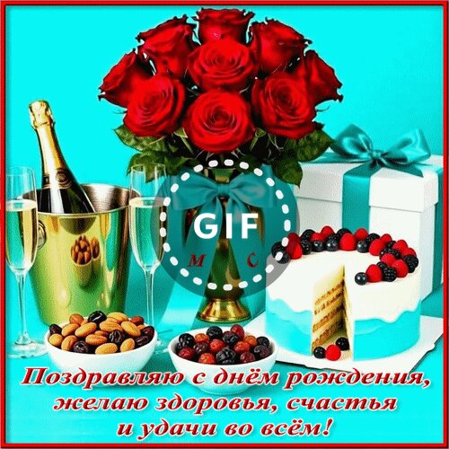 Анимированная открытка "Поздравляю с днём рождения, желаю здоровья, счастья и удачи во всём!, (М. С.)"