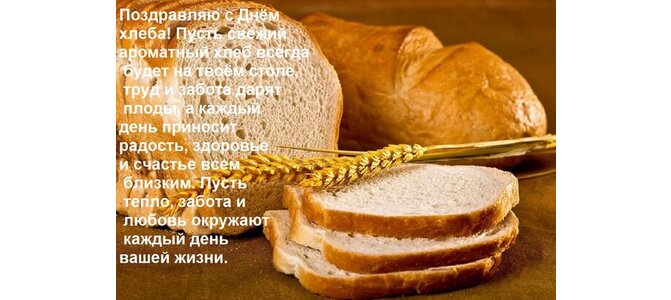 Теги:поздравляю с днём хлеба пусть свежий ароматный хлеб всегда будет на твоём столе, труд и забота дарят плоды, а каждый день приносит радость, здоровье и счастье всем близким пусть тепло, забота и любовь окружают каждый день вашей жизни