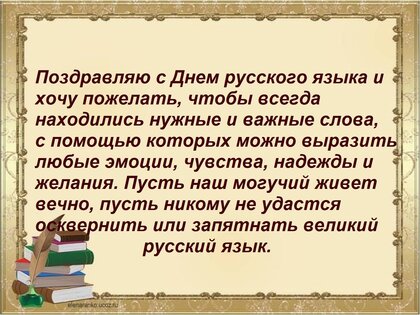 Поздравляю с Днем русского языка и хочу пожелать, чтобы всегда находились нужные и важные слова, с помощью которых можно выразить любые эмоции, чувства, надежды и желания. Пусть наш могучий живет вечно, пусть никому не удастся осквернить или запятнать великий русский язык. elenaranko. ucoz. ru elenaranko. ucoz. ru