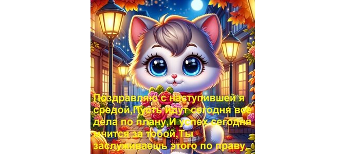 Теги:поздравляю с наступившей я средой, пусть идут сегодня все дела по плану, и успех сегодня мчится за тобой, ты заслуживаешь этого по праву