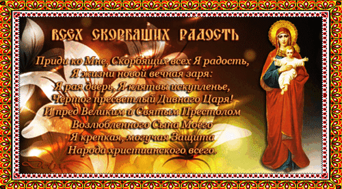 Всех скорбящих Радость. Приди ко мне, скорбящих всех я радость, я жизни новой вечная заря: я рая дверь, я клятвы искупленье, чертог пресветлый дивнаго царя! И пред Великим и Святым Престолом возлюбленного сына моего я крепкая, могучая защита народа христианского всего.