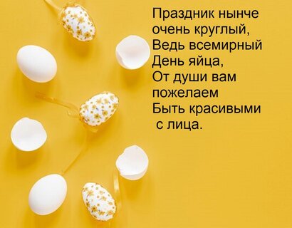 Теги:праздник нынче очень круглый, ведь всемирный день яйца, души, вам, пожелаем, быть, красивыми, лица