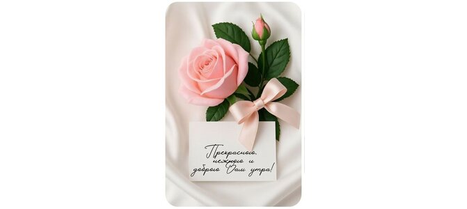 На атласе лежит розочка, перевязанные бантиком и рядом записка с пожеланием доброго утра.
