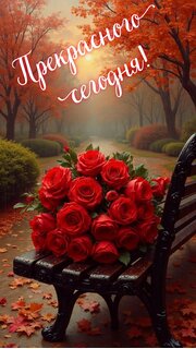 В осеннем парке на скамейке лежит прекрасный букет алых роз