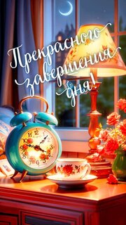 Около окна на прикроватной тумбочке стоит зажженная настольная лампа, стоит чашка чая и будильник, показывающий вечернее время