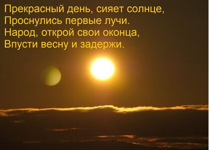 Открытка "Прекрасный день, сияет солнце, Проснулись первые лучи. Народ, открой свои оконца, Впусти весну и зад"