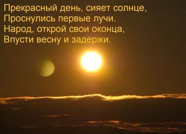 Теги:прекрасный день, сияет солнце, проснулись первые лучи народ, открой свои оконца, впусти весну и задержи