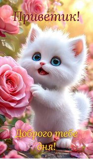 Мультяшный котëночек стоит среди роз. Надпись на открытке "Приветик! Доброго тебе дня!"