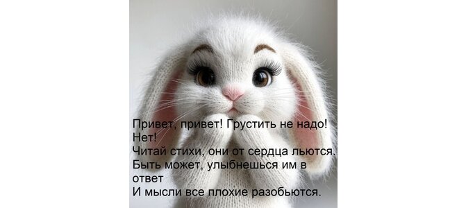 Теги:привет, привет грустить не надо нет читай стихи, они от сердца льются быть может, улыбнешься им в ответ и мысли все плохие разобьются
