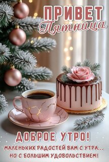 Открытка "ПРИВЕТ ПЯТНИЦА. ДОБРОЕ УТРО! МАЛЕНЬКИХ РАДОСТЕЙ ВАМ С УТРА... НО С БОЛЬШИМ УДОВОЛЬСТВИЕМ!"