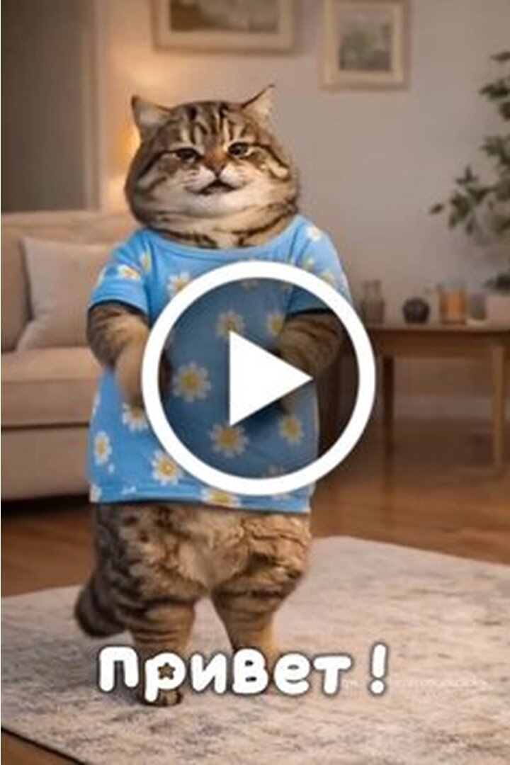 В этом позитивном и забавном видео вы увидите очаровательного полосатого кота, который одет в голубую футболку с принтом в виде белых ромашек. Кот активно танцует и приветствует зрителей своими движениями лап, создавая атмосферу радости и веселья. В начале ролика на экране появляется надпись привет, а затем видео наполняется пожеланиями хорошего настроения. Это идеальный контент для того, чтобы поднять себе настроение и улыбнуться, глядя на танцующего пушистого героя в уютной домашней обстановке.