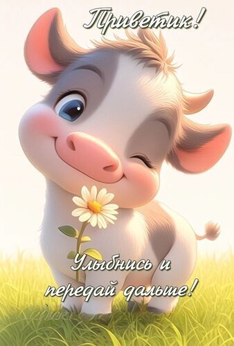 Милая и добрая открытка с изображением мультяшного теленка. Маленький белый теленок с розовым носом, большими голубыми глазами и дружелюбной улыбкой стоит на зеленой лужайке и держит белый цветок ромашки. На картинке расположены надписи на русском языке: «Приветик!» сверху и «Улыбнись и передай дальше!» снизу. Изображение выполнено в мягком, светлом стиле, идеально подходит для отправки друзьям и близким в мессенджерах (WhatsApp, Viber) для поднятия настроения и пожелания доброго дня.