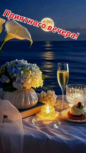 На берегу моря прекрасно сервированный стол для ужина. На небе луна.