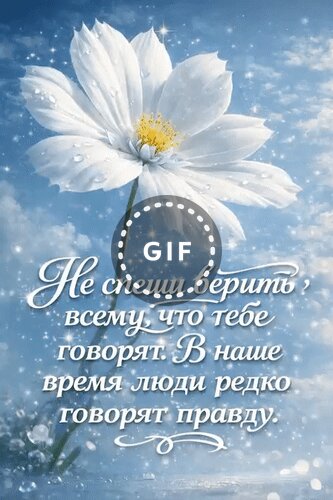Красивое эстетичное изображение белого цветка космеи с капельками росы на лепестках на фоне нежно-голубого неба с облаками. На картинке нанесен мотивирующий текст на русском языке: " Не спеши верить всему, что тебе говорят. В наше время люди редко говорят правду". Изображение наполнено светом, мерцающими частицами и атмосферой мудрости и спокойствия. Подходит для использования в качестве цитаты дня, статуса в соцсетях или открытки с глубоким смыслом.