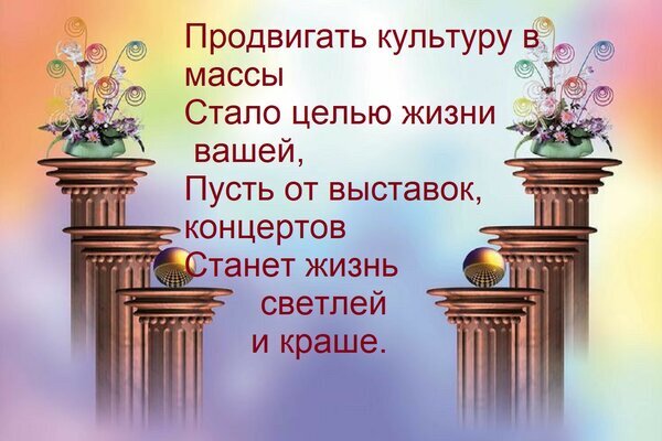 Открытка "Продвигать культуру в массы Стало целью жизни вашей, Пусть от выставок, концертов Станет жизнь светл"