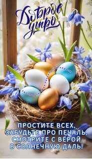 Красивая поздравительная открытка к Светлой Пасхе. На уютном фоне в гнезде лежат раскрашенные пасхальные яйца в золотистых, голубых и белых тонах, окруженные нежными цветами подснежников и колокольчиков. На изображении надпись «Доброе утро» и вдохновляющая цитата: «Простите всех, забудьте про печаль, смотрите с верой в солнечную даль!». Атмосфера праздника, весны и умиротворения. Идеально подходит для отправки близким в мессенджерах и социальных сетях.
