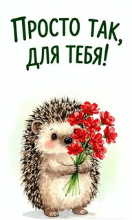 Милая и эмоциональная открытка с изображением очаровательного ежика, который держит в лапках букет ярких красных цветов. На картинке расположена вдохновляющая надпись на русском языке: «Просто так, для тебя!». Иллюстрация выполнена в нежном акварельном стиле на чистом белом фоне, что делает её идеальной для отправки в мессенджерах, социальных сетях или в качестве цифровой поздравительной открытки без особого повода, чтобы поднять настроение близкому человеку, подруге или любимой.