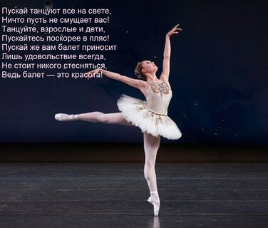 Теги:пускай танцуют все на свете, ничто пусть не смущает вас танцуйте, взрослые и дети, пускайтесь, поскорее, пляс, пускай, вам, балет, приносит, лишь, удовольствие, всегда