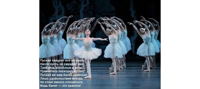 Теги:пускай танцуют все на свете, ничто пусть не смущает вас танцуйте, взрослые и дети, пускайтесь поскорее в пляс пускай же вам балет приносит лишь удовольствие всегда, не стоит никого стесняться, ведь балет это красота
