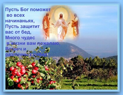 Теги:пусть бог поможет во всех начинаньях, пусть защитит вас от бед, много чудес в жизни вам пожелаю, встреч и различных побед