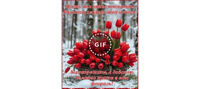 Анимированная открытка "Пусть эти яркие тюльпаны развеют хмурых дней печаль. Вы разрешите, я добавлю немного красок в ваш фе"