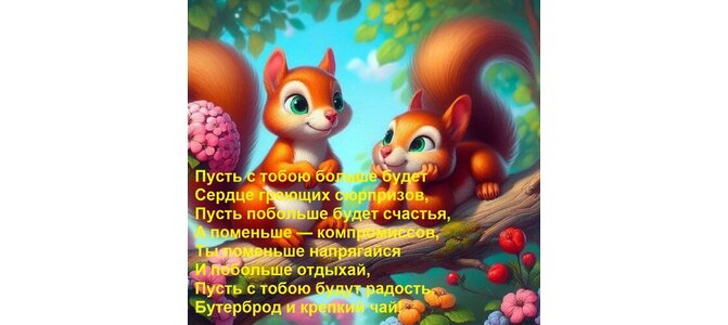 Теги:пусть, тобою, больше, будет, сердце, греющих, сюрпризов, пусть побольше будет счастья, а поменьше компромиссов, ты поменьше напрягайся и побольше отдыхай, пусть с тобою будут радость, бутерброд и крепкий чай