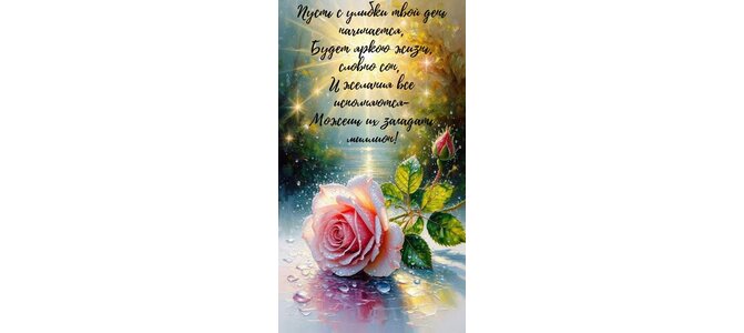 На заднем плане море, деревья. На первом плане роза и надпись "Пусть с улыбки твой день начинается, будет яркою жизнь, словно сон, и желания все исполняются. Можешь их загадать миллион!"