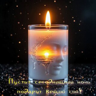 Атмосферная и вдохновляющая открытка с изображением горящей свечи в прозрачном стакане. На поверхности воска проступает сюрреалистичный образ человеческого лица, внутри которого отражается закат над спокойной морской гладью. Фон украшен мерцающими золотистыми искрами, создающими магическую ночную атмосферу. В нижней части изображения расположена красивая надпись на русском языке золотыми буквами: "Пусть сегодняшняя ночь подарит вещий сон!". Идеально подходит для пожеланий доброй ночи, душевного спокойствия и магических снов.