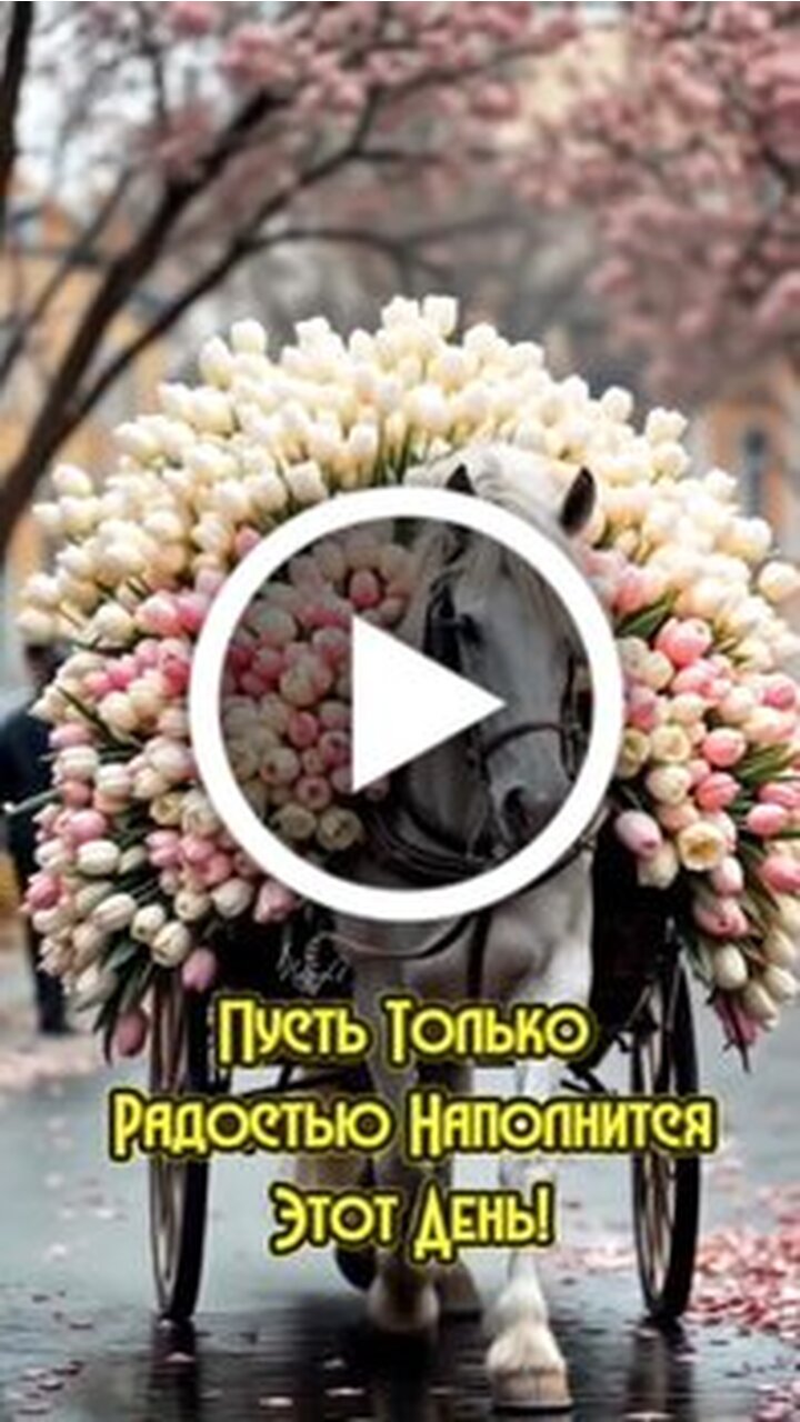 Красивое видео с белой лошадью, везущей по старинной европейской улочке телегу, доверху наполненную роскошными цветами. Сюжет представляет собой эстетическую смену образов: сначала лошадь везет огромные букеты розовых роз, затем тюльпанов белого и розового цвета, а завершается видео пышными шарами голубых и белых гортензий. На фоне видны уютные городские здания и цветущие деревья. Поверх видео наложен текст на русском языке с пожеланием, чтобы этот день наполнился только радостью. Видео наполнено атмосферой весеннего праздника, нежности и вдохновения.