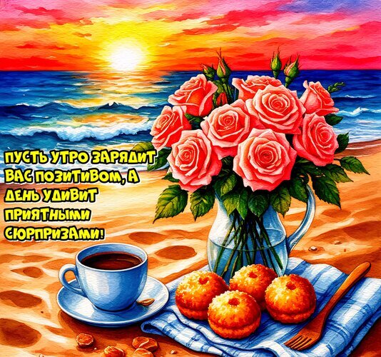 Красочная поздравительная открытка с изображением букета нежно-розовых роз в стеклянной вазе на фоне живописного морского заката. На переднем плане уютный завтрак: чашка ароматного кофе и аппетитные булочки на клетчатой салфетке. Атмосферная картинка на песчаном пляже дополнена мотивирующей надписью на русском языке: "Пусть утро зарядит вас позитивом, а день удивит приятными сюрпризами!". Идеально подходит для доброго утреннего пожелания в социальных сетях, мессенджерах или для отправки близким человеку для создания хорошего настроения.