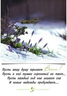 Пусть вашу душу трогает весна! Пусть в ней туман сиреневый не тает. Пусть каждый под она лишает сна и новые надежды пробуждает...