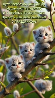 Открытка "Пусть вербочки, как кошки, Мурлыкают в ладошке, И с Вербным Воскресеньем Придёт к нам всем спасение!"