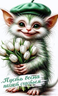 Милая и очаровательная цифровая иллюстрация с изображением пушистого котенка в зеленом берете, который держит букет белоснежных тюльпанов. На картинке присутствует надпись на русском языке: "Пусть весна пахнет счастьем". Изображение выполнено в нежных, весенних тонах, передает атмосферу радости, тепла и праздника. Идеально подходит для поздравительных открыток, пожеланий весны, девичьих открыток и создания весеннего настроения в социальных сетях.***