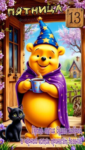 Теги:пятница13 виннипух черныйкот магия везение добрыепожелания цифровоеискусство яркиекраски весна2026 иллюстрация сказочныйперсонаж мастерскаяоткрыток