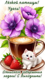 Теги:пятница, дни недели, удачи, красивая картинка, добрый день, отличного завершения недели, с выходными, выходные, котенок, клубничка, кофе, фрукты, цветы