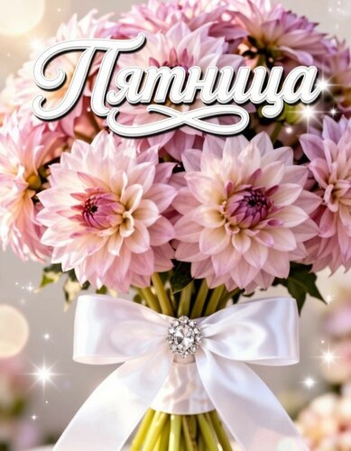 Красивая и нежная открытка с пышным букетом розовых георгинов. Цветы украшены элегантной белой атласной лентой с сияющей стразой в центре. На переднем плане каллиграфическим шрифтом написано слово «Пятница», создавая атмосферное поздравление с началом выходных. Изображение наполнено мягким светом, сверкающими бликами и романтичной атмосферой, идеально подходящей для отправки друзьям и близким в мессенджерах или социальных сетях.