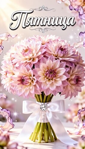 Красивое поздравительное изображение с пышным букетом нежно-розовых георгинов. Цветы аккуратно перевязаны широкой белой атласной лентой с блестящей декоративной брошью в центре. На фоне мягкий свет, мерцающие искры и лепестки, создающие атмосферу праздника и уюта. Сверху крупным декоративным шрифтом на русском языке написано слово «Пятница». Идеально подходит для отправки в мессенджерах и социальных сетях в качестве доброго пожелания хорошего вечера или начала выходных.