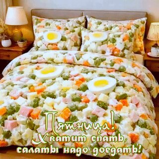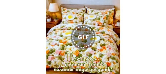 Анимированная открытка "Пятница! Хватит спать, салаты надо доедать!"