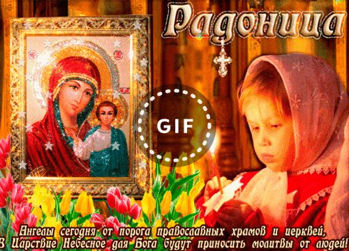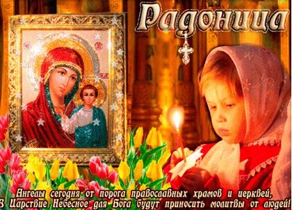 Религиозная праздничная открытка к Радонице. На изображении представлена икона Богородицы в золотой раме и маленькая девочка в платке, держащая зажженную свечу. На фоне — теплый свет церковных свечей и яркие весенние тюльпаны. Текст на русском языке гласит о молитвах, которые ангелы приносят в Царство Небесное от порогов православных храмов. Атмосферное изображение, передающее свет, надежду и духовную связь.
